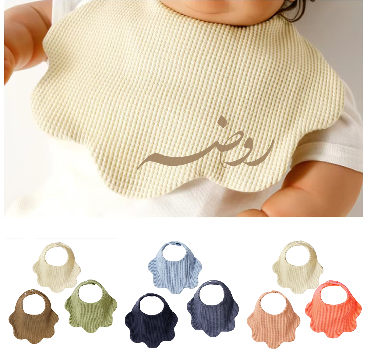 مريلات أطفال قطنية 100% مصممة باسم طفلك أو باللوقو، متوفرة بعدة ألوان