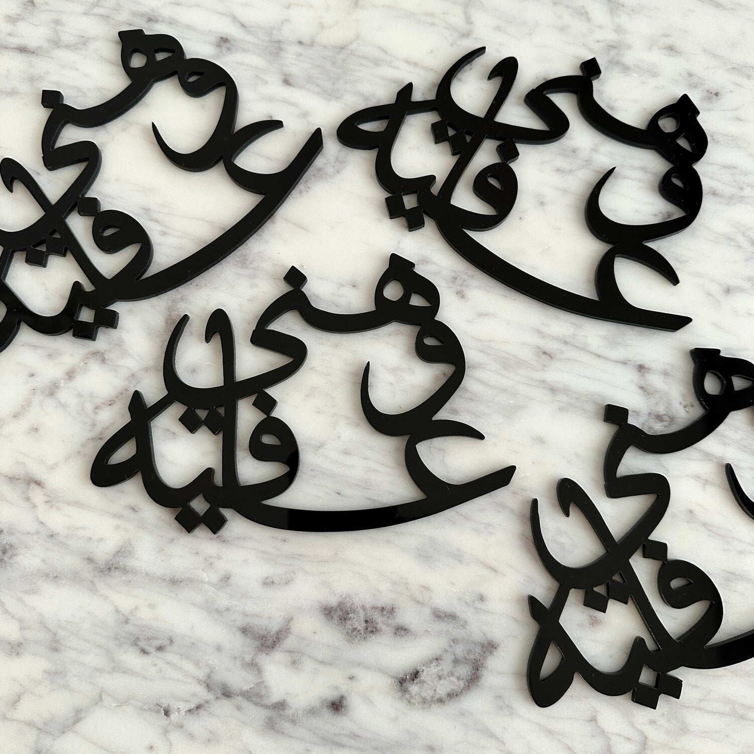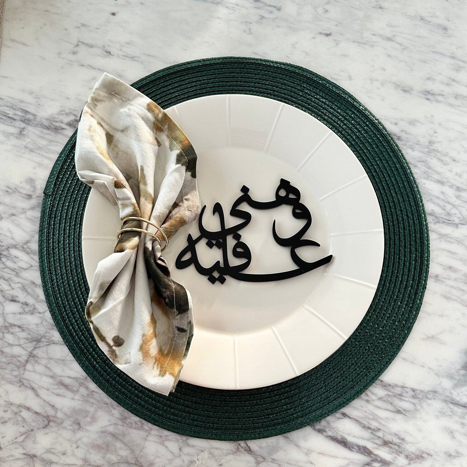 بطاقات أكريليك باللون الأسود الأنيق بتصميم عربي "هني وعافية"، تستخدم لتزيين الصحون
