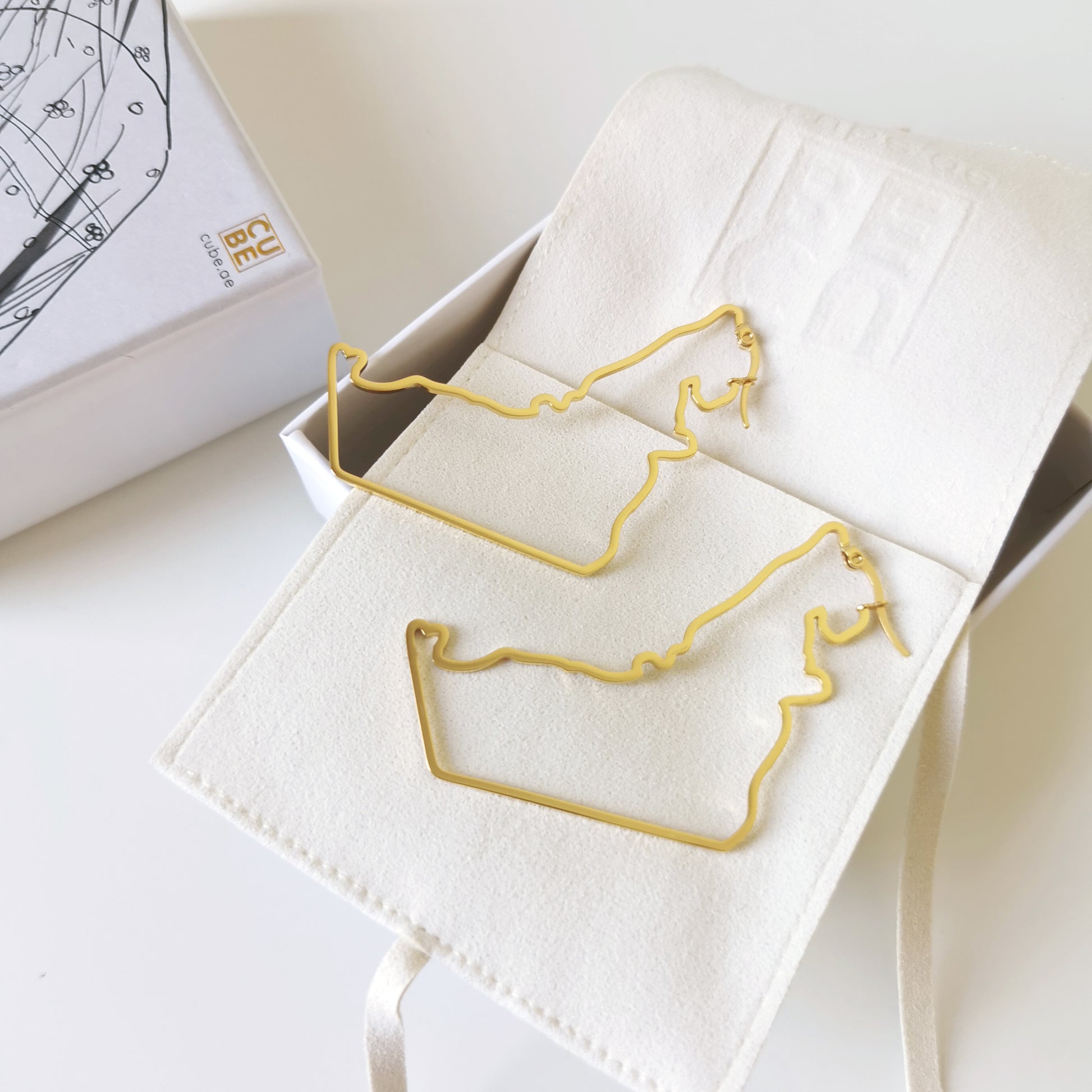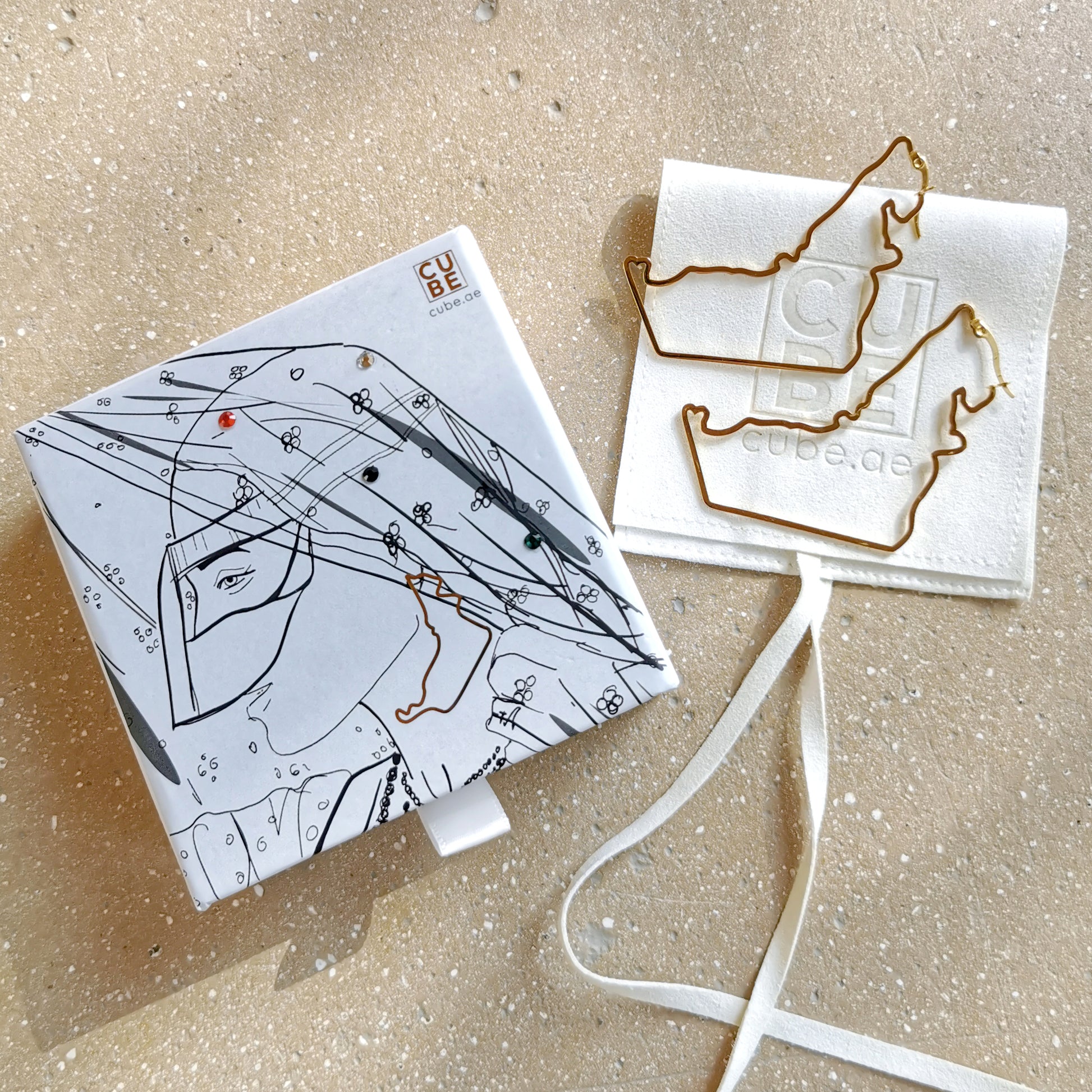 أقراطنا حصرية بتصميم خريطة الامارات، مثالية كهديه وللتوزيعات. الاقراط مغلفه في حقيبة مخملية وصندوق أنيق يحمل طابع تراثي مصمم بأحجار الراين الملونة
