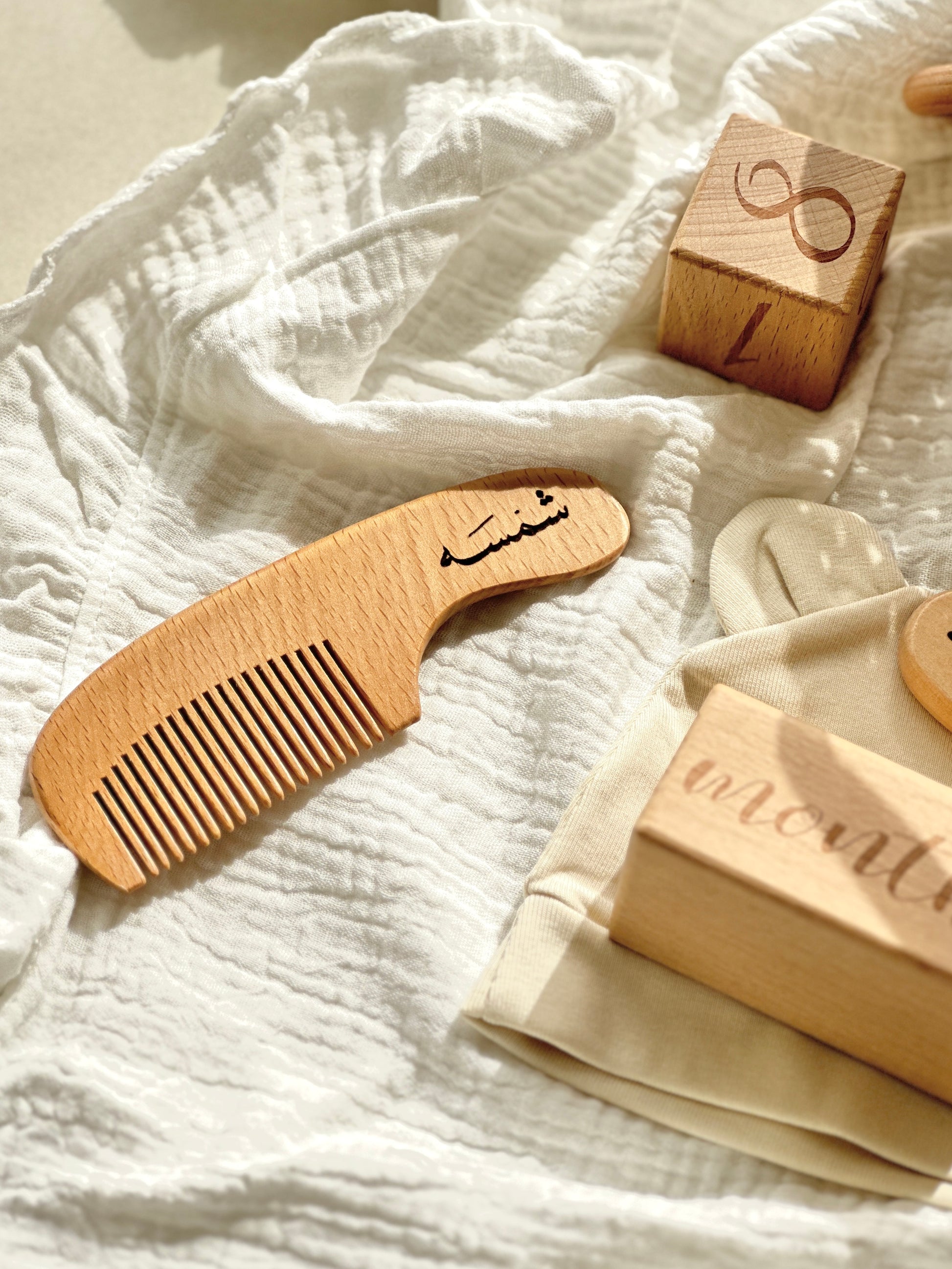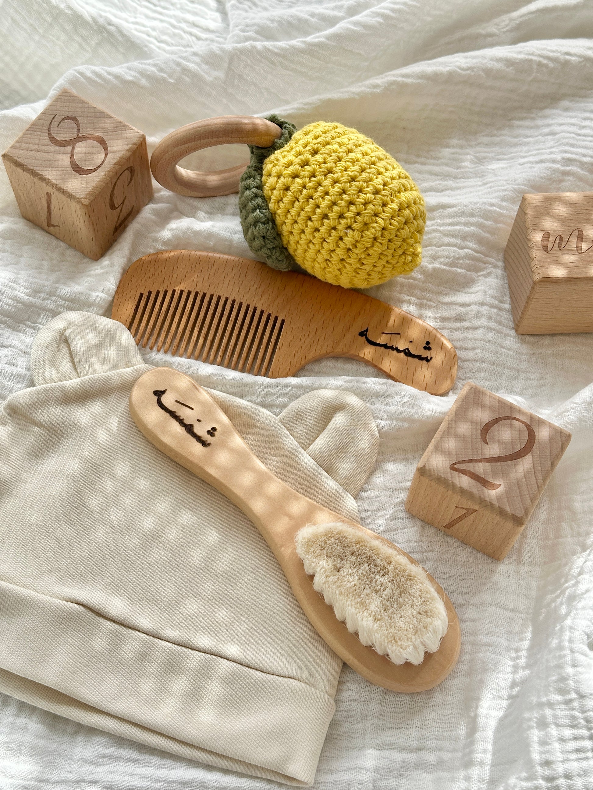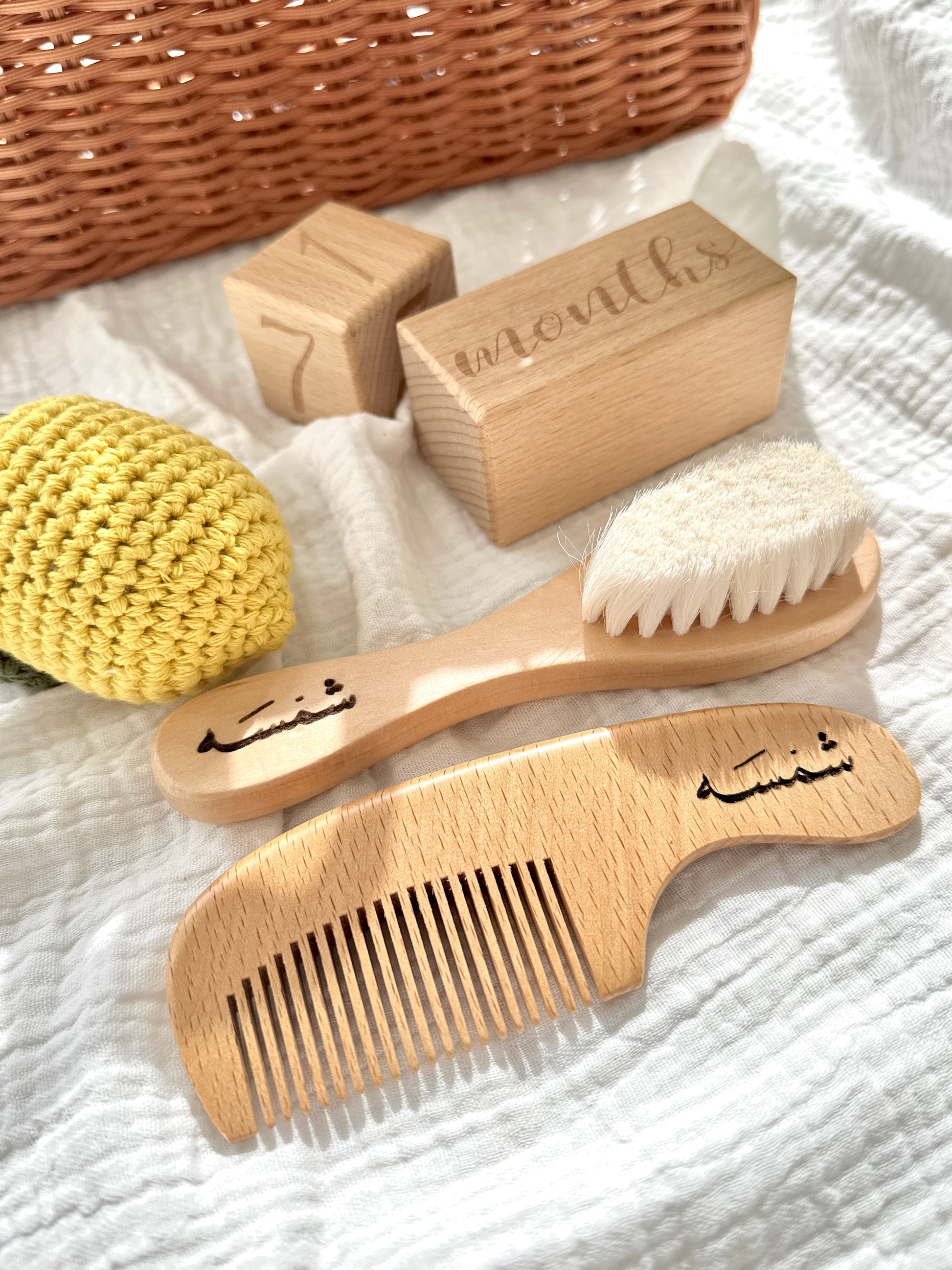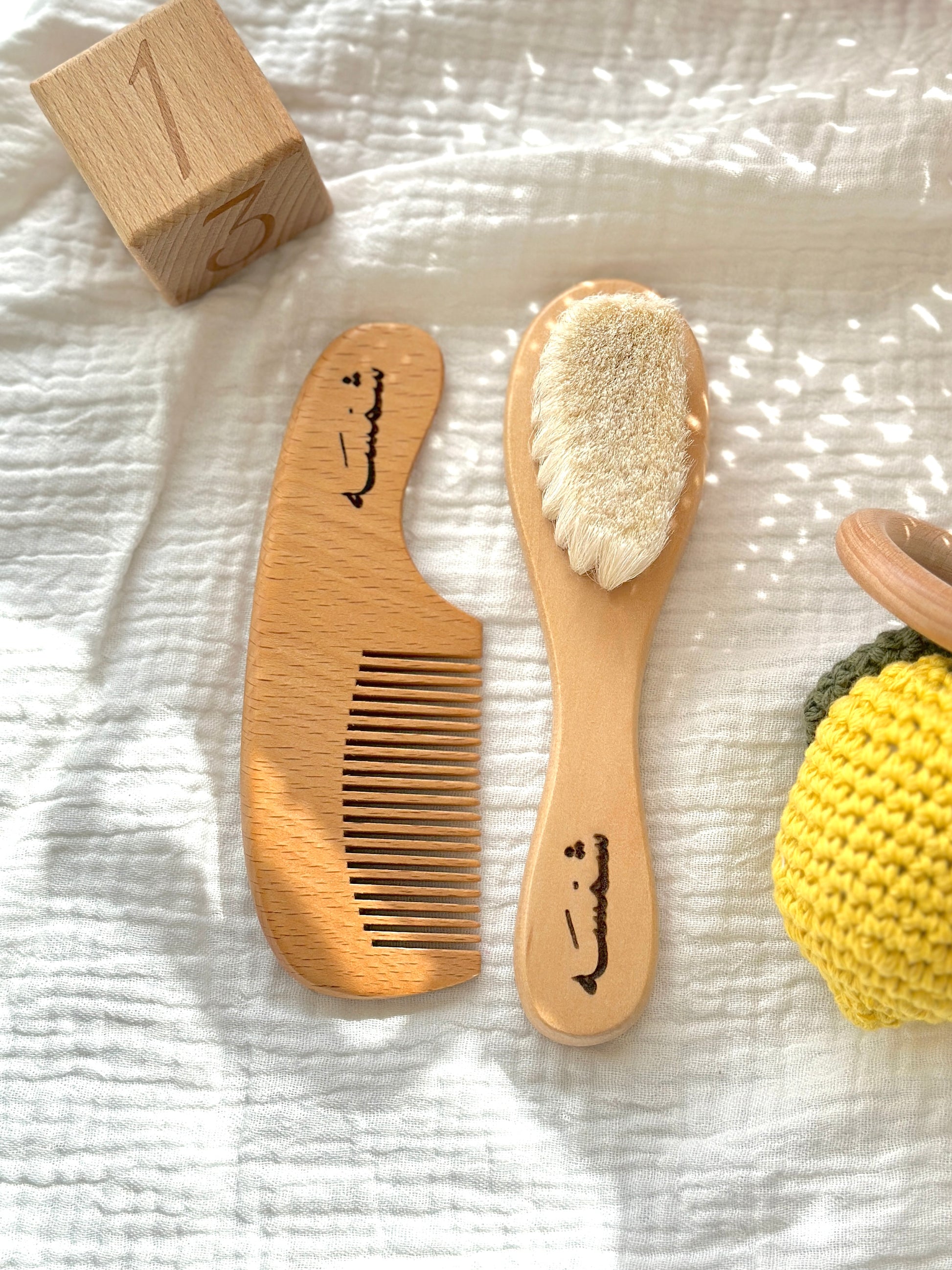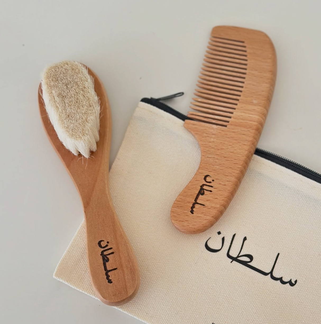 طقم مشط وفرشاة شعر خشبي للبيبي محفور بالاسم او اي تصميم، ناعم ولطيف على فروة الرأس، مثالي كهدية مميزة للمولود الجديد