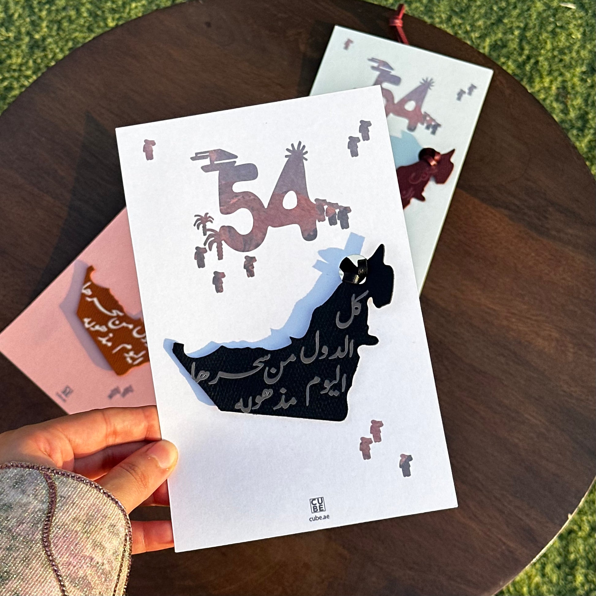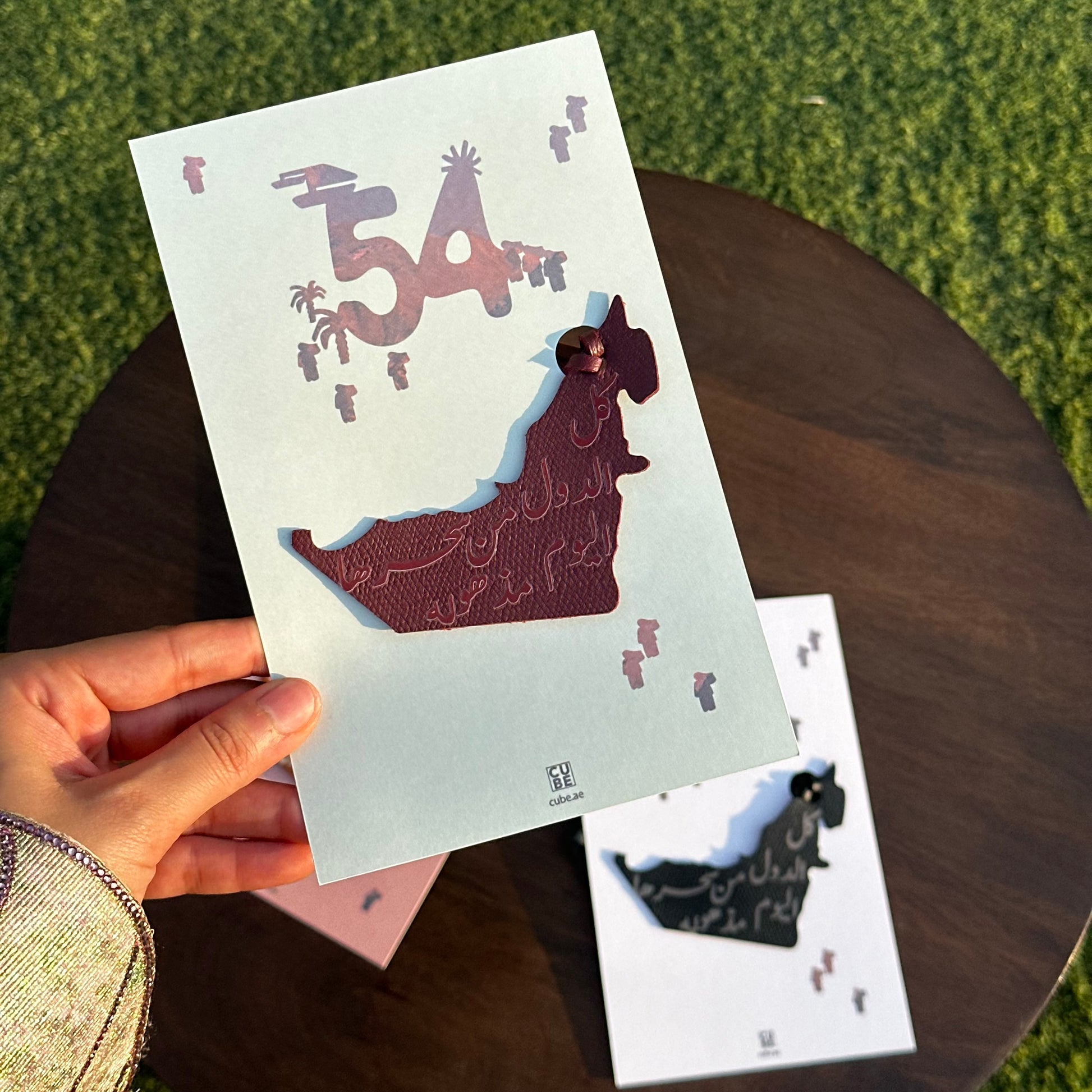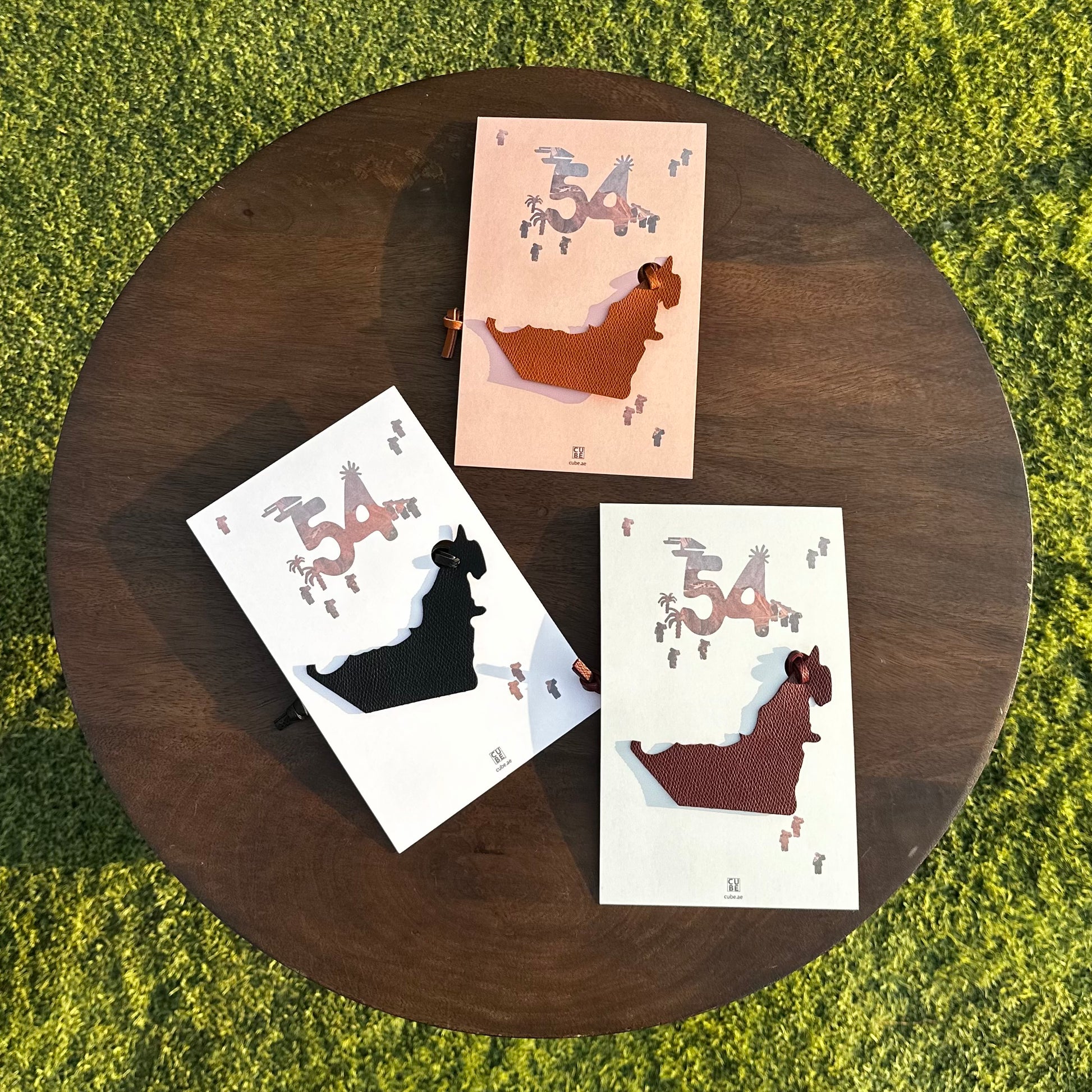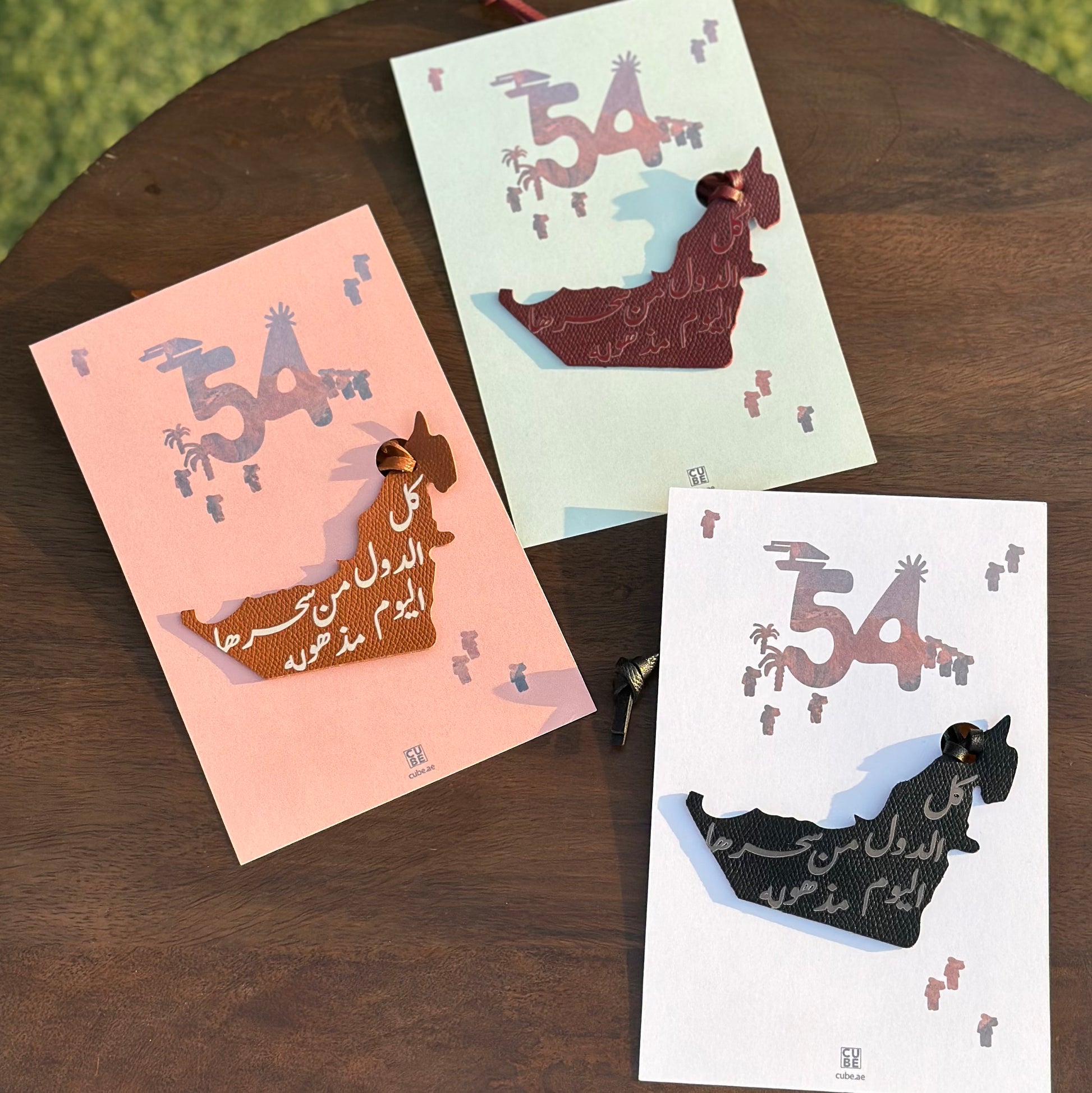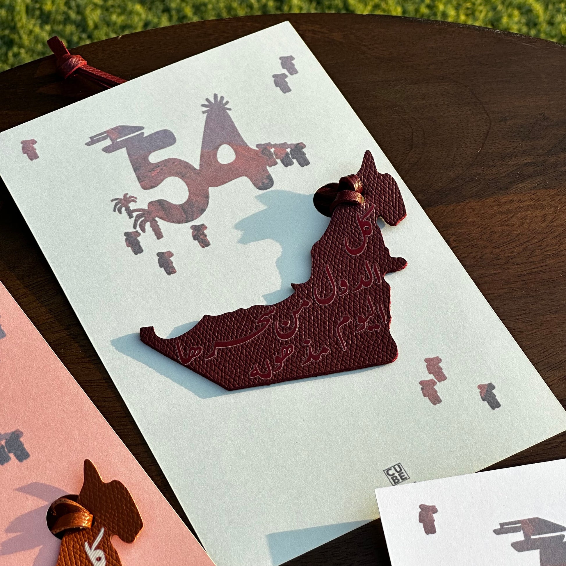 توزيعات عبارة عن بطاقات مع ميدالية جلد خريطة الامارات بتصميم عيد الاتحاد (كل الدول من سحرها اليوم مذهوله)
